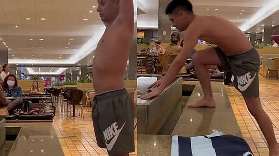 Após nadar ao longo do chafariz, um homem, que estava sentado em uma das mesas da praça de alimentação, levantou e pediu para que o rapaz saísse de dentro da estrutura. Outras pessoas são vistas se alimentando enquanto a cena acontece. A cena foi divulgada por ele na última semana.