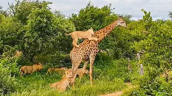 Uma presa desse tamanho dificilmente é ignorada por esses predadores, e um dos embates foi filmado de perto por um guia de safári na África do Sul. Francois Pienaar conta que, em anos nessa profissão, essa foi sua visão mais impressionante: pelo menos cinco leões, machos e fêmeas, tentando derrubar uma girafa, com uma delas chegando a “pegar uma carona” nas costas do enorme mamífero.
