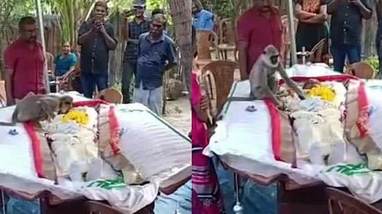 Um pequeno macaco chamou a atenção durante um velório em Talanguda, no estado de Tamil Nanu na Índia. O animal subiu no caixão onde estava Peetambaram Rajan, que morreu aos 56 anos, e ficou bem próximo ao corpo.