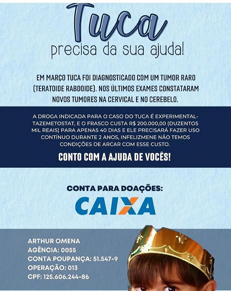 Uma batalha pela vida. A mãe do pequeno Arthur Omena, de 7 anos, usou as redes sociais para fazer um apelo, na noite desse sábado, 07, com o intuito de colher recursos para a compra de um medicamento experimental para o tratamento da criança, diagnosticada com tumores no cérebro e na coluna.