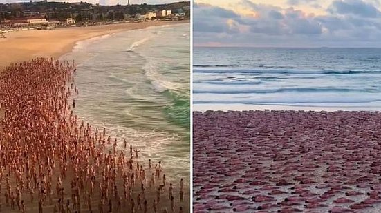 Milhares de pessoas se despiram neste sábado (26) na icônica praia de Bondi, em Sydney, na Austrália, para uma instalação de arte destinada a aumentar a conscientização sobre o câncer de pele e a segurança ao sol.
