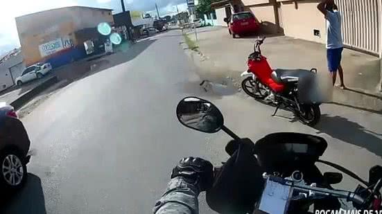 Quando os policiais se aproximam, o suspeito está com a motocicleta parada em uma esquina, e é quando começa a abordagem; assista as imagens: