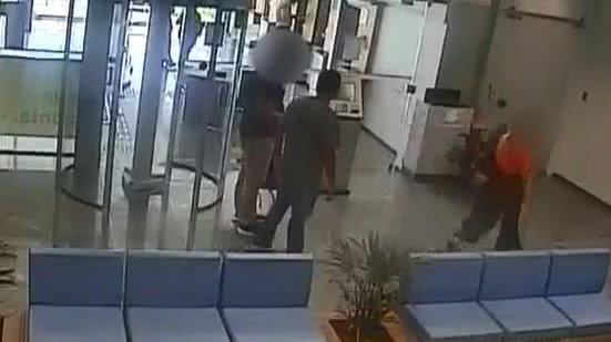 A primeira parte do vídeo mostra um criminoso com dois funcionários rendidos, sendo um homem com uma mochila, que seria o vigilante, e uma mulher com duas bolsas, que teria acesso à parte interna do prédio. Eles passam pela seção dos caixas eletrônicos para o segundo espaço do banco, pela porta giratória.
