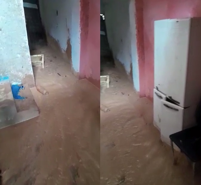 As imagens acima apresentam, em um primeiro instante, a força da água que desce pela escada da entrada da residência. Os móveis da casa aparecem já em contato com a lama e a família cita que está ilhada no local. Do primeiro andar, os moradores destacam que o sofá, a geladeira e outros bens foram atingidos.