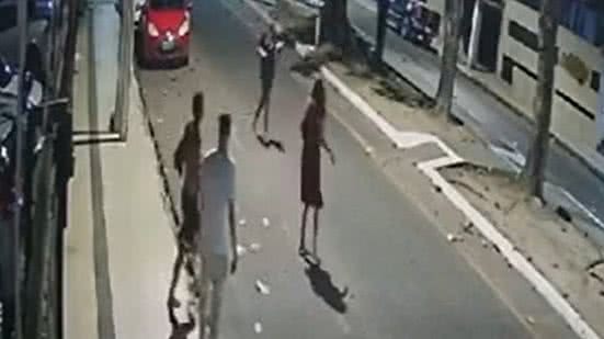 As imagens mostram um dos suspeitos se aproximando de um casal, quando, ao fundo, o outro chega apressado e pega o celular da mulher. Os dois conseguem fugir. Segundo as vítimas, o que fez a abordagem aparentava ser menor de idade.