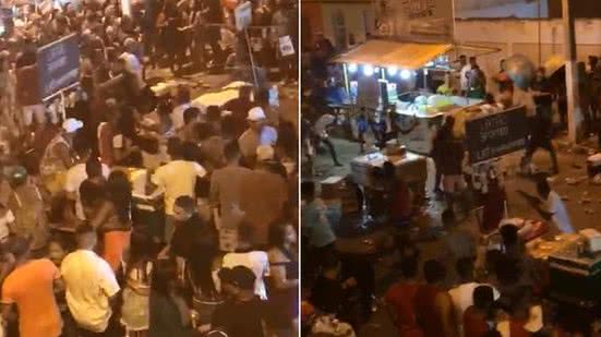 Nas imagens é possível observar que há uma correria no meio da rua e um grupo troca agressões, enquanto ambulantes e parte do público que curtia o show tentam se afastar do local da pancadaria. Garrafas de vidro, latas, pedras e até um caixa térmica são arremessadas durante a confusão.