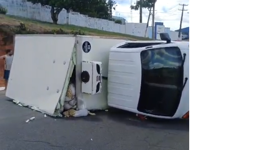 O veículo de cor branca ficou com o lado do banco do passageiro junto ao chão depois do tombamento. Em vídeo enviado ao TNH1, deu para perceber que o teto se abriu parcialmente e alguns produtos transportados caíram no asfalto. Assista: