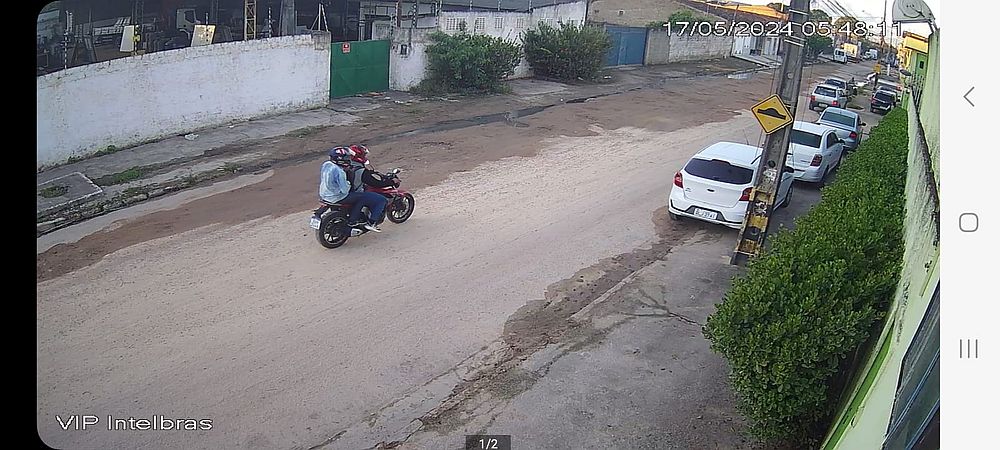 Uma outra câmera mostra o comparsa do homem armado. Ele é o condutor da moto e está com casaco nas cores preta e cinza, além da calça jeans. Os dois usam capacete e são filmados segundos antes do crime. Confira a imagem: