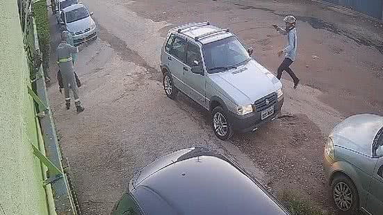 Uma outra câmera mostra o comparsa do homem armado. Ele é o condutor da moto e está com casaco nas cores preta e cinza, além da calça jeans. Os dois usam capacete e são filmados segundos antes do crime. Confira a imagem: