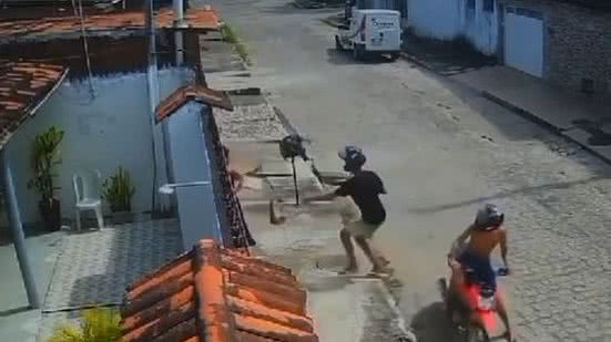 Imagens de uma câmera de segurança no local flagraram o momento em que a mulher está chegando em casa quando, ao tentar abrir a porta, a dupla se aproxima na moto, para próximo a ela, aponta a arma - uma espingarda artesanal calibre 12 -, rouba a bolsa e vai embora. Veja abaixo: