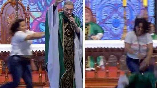 Uma mulher empurrou o padre Marcelo Rossi do palco de um evento na tarde deste domingo em Cachoeira Paulista (SP). O vídeo que mostra o momento em que o religioso cai do palco se espalhou pelas redes sociais.
