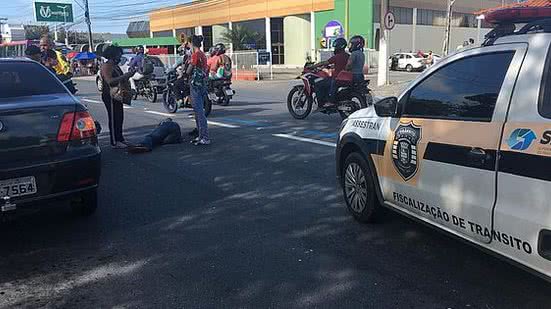 Após a queda, a mulher que usava capacete ficou no meio da pista e, por sorte, nenhum outro veículo a atropelou. Ela aguardou o socorro médico por alguns instantes.