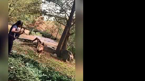 Um vídeo de uma mulher tentando interagir com um leão dentro de uma área reservada em um zoológico nos Estados Unidos viralizou nas redes sociais. Não aconteceu nenhum fato grave com ela.