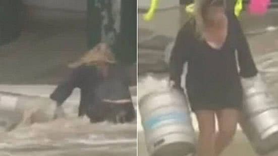 Enfrentando as águas turbulentas da "tsunami", uma mulher encarou as ondas que batiam muito além do ponto habitual para agarrar dois barris de metal e carregá-los de volta à terra firme.