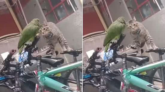 Um vídeo protagonizado por um papagaio e um gato viralizou nas redes sociais.