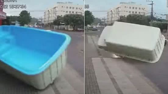 Em um vídeo divulgado nas redes sociais, é possível ver a piscina sendo arremessada na rua e invadindo a pista dos carros. O objeto também quase colide com um veículo que passava pelo local.