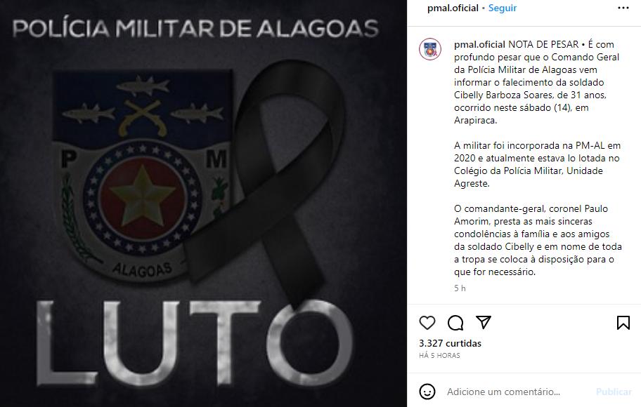 Em um publicação feita nas redes sociais, a Polícia Militar de Alagoas lamentou a morte de Cibely.