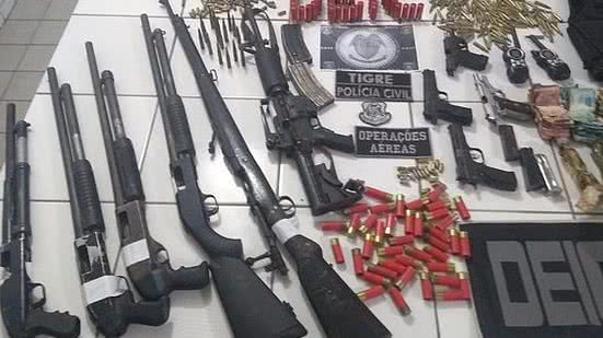 Entre o material, foram apreendidas escopetas calibre 12, fuzis, pistolas, incluindo algumas de calibre restrito, muita munição e equipamentos como coletes e balaclavas.