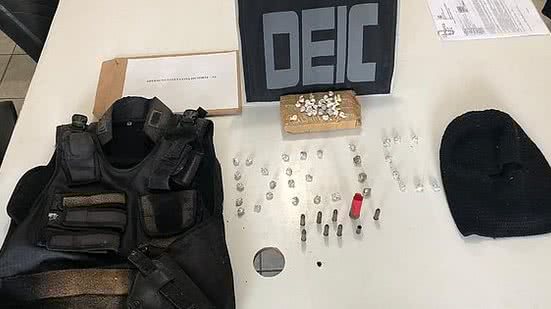 Duas pessoas foram presas e conduzidas à sede da Deic. Com eles a polícia apreendeu aproximadamente 1kg de maconha, 40 pedras de crack, um colete à prova de balas, uma touca ninja e diversas munições.