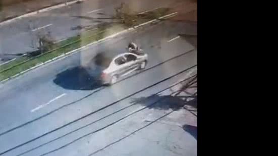 As imagens mostram o momento em que o policial se coloca à frente do veículo, um Peugeot 207, e mesmo assim, a condutora arranca com o carro. Com isso, o policial vai parar em cima do capô do automóvel.