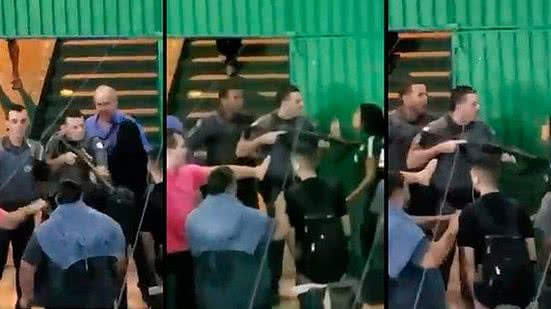 Um vídeo que circula nas redes sociais mostra um policial armada totalmente descontrolado dentro da escola estadual Frederico de Barros Brotero, localizada na Vila Progresso, em Guarulhos, na grande São Paulo.