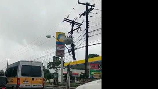 O registro foi feito por um motorista que passava pela localidade. No vídeo, é possível perceber um transformador fixado na estrutura do poste e suspenso pelos fios de alta tensão. Veja.