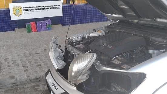 Cerca de 50 kg de pasta base de cocaína foram apreendidos na manhã de hoje (06) pela Polícia Rodoviária Federal. O suspeito foi abordado na BR 101, em Alagoas, dirigindo uma Hillux/SW4, de cor cinza e na companhia de sua esposa e filha de 9 anos. Toda a droga foi encontrada escondida em compartimentos do veículo.