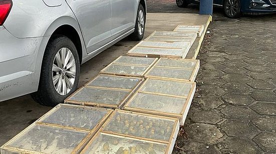 Os agentes então realizaram um acompanhamento e conseguiram abordar o veículo, cerca de 200 metros depois. Após verificação da documentação pessoal e veicular, os policiais fizeram uma vistoria no carro, momento em que foram encontradas 09 gaiolas de pássaros silvestres, com aproximadamente 550 pássaros, sendo 200 da espécie canário da terra, 100 papa-capim e 250 caboclinho, alguns já estavam mortos em virtude da má e precária acomodação dos mesmos na mala do veículo, sem sequer água e comida.