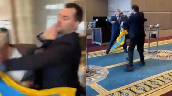Em outro vídeo, parlamentares ucranianos abrem uma bandeira do país durante o discurso da representante russa Olga Timofeeva, iniciando a confusão. Auxiliares turcos, que participam do evento, pedem que a bandeira seja retirada.