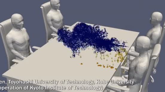 Uma simulação feita no supercomputador japonês Fugaku (considerado o mais rápido do mundo) mostra como o novo coronavírus pode se espalhar em locais de alimentação, como restaurantes e lanchonetes. O vídeo, publicado no canal do YouTube da emissora japonesa Nippon News, mostra como a covid-19 pode ser transmitida por pessoas na mesma mesa.