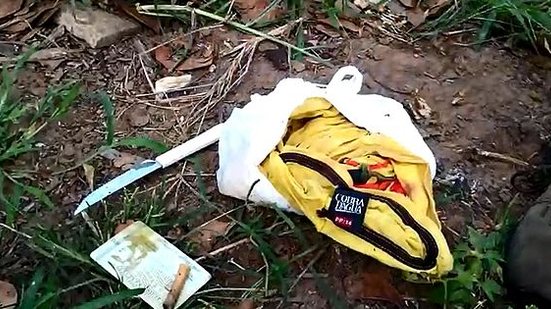 Os agentes registraram em vídeo o momento em que acharam a faca de serra, uma camiseta amarela suja de sangue que teria sido usada por Danilo, luvas descartáveis, papéis e uma agulha. “Essas luvas foram usadas pelo Júnior, quando a gente tava limpando a casa”, explicou o rapaz.