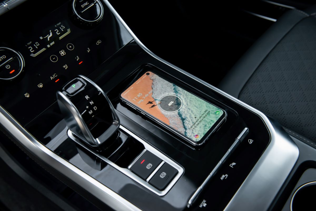 O console central abriga também, ao lado da alavanca de câmbio, um sistema de carregamento de celular por indução, sem cabos (wireless). Já o compartimento central, além de funcionar como apoio de braço, possui interior refrigerado.