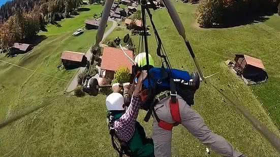Um vídeo divulgado nas redes sociais mostra momentos de pavor e medo que o turista norte-americano, Chris Gursky, passou ao voar de asa-delta pelos Alpes Suíços, em seu primeiro dia de viagem. O viajante levou um susto ao identificar que o mosquetão usado para prendê-lo ao equipamento havia falhado.