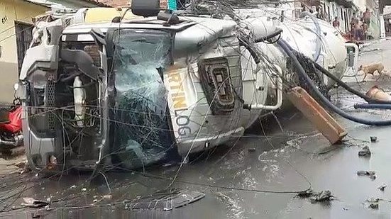 As imagens registradas por populares mostram o caminhão tombado e despejando líquido na ladeira. Assista abaixo.