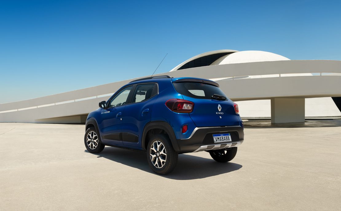 A parte alta da traseira remete à vocação urbana do Kwid, com lanternas com a nova identidade luminosa em LED, únicas na categoria. Já a parte de baixo é dotada de atributos de segurança dignos de um SUV: o robusto para-choque traseiro agora traz os refletores integrados, melhorando a visibilidade e reforçando a segurança. A versão Outsider traz ainda um protetor de carroceria (skis frontais e traseiros) pintado na cor cinza. Com perfil imponente e robusto, o Kwid expressa modernidade e dá a impressão de ser maior que os seus 3.680 m de comprimento. As versões Intense com teto bíton e Outsider passam a vir de série com rodas de liga leve de 14 polegadas diamantadas em duas cores. A versão Intense traz novo desenho de calota com a inédita tecnologia Flexwheel bíton.
