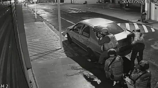 Os criminosos abandonaram dois veículos na frente de um batalhão da Polícia Militar da cidade. Eles colocaram fogo em um dos carros para impedir a saída dos policiais do batalhão.