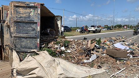 O tombamento de um caminhão carregado de entulhos na Avenida Rota do Mar, sentido Guaxuma/Benedito Bentes, provocou a queda do motociclista identificado como Cláudio Humberto Monteiro dos Santos, 41 anos, na manhã desta sexta-feira, 25. O homem, que ficou ferido ao cair do veículo, apresentou luxação no ombro e foi encaminhado a uma unidade de saúde para os cuidados médicos. Já o condutor do caminhão estava com ferimentos leves. O trânsito ficou lento.