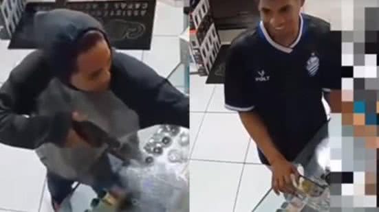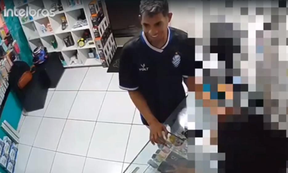 Em seguida, ele se encaminha para a área de prateleiras para dar início ao recolhimento dos produtos. Enquanto isso, o segundo criminoso, que aparece com uma camisa do CSA na cor preta, se aproxima do balcão e obriga a funcionária a passar outros aparelhos colocados na vitrine.