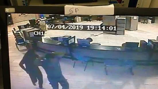 Nas imagens é possível ver os assaltantes rendendo os vigilantes. É possível observar que os bandidos cobrem o rosto quando se aproximam das câmeras; assista:
