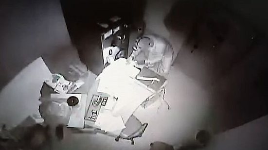 Já neste vídeo é possível observar a ação de dois criminosos que aparecem com luvas e com lanternas nos capacetes dentro de uma sala. Um deles colocou um material explosivo próximo a um cofre e, depois de acioná-lo, deixou o local. Após a explosão, o sinal de vídeo foi perdido.