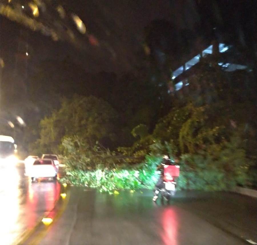 No momento em que caía a forte chuva em Maceió, uma árvore desabou no meio da Ladeira Geraldo Melo, no Farol, e obstruiu a passagem dos veículos até a parte alta da capital. O Corpo de Bombeiros foi acionado por volta das 19h30 para retirar o tronco da via.