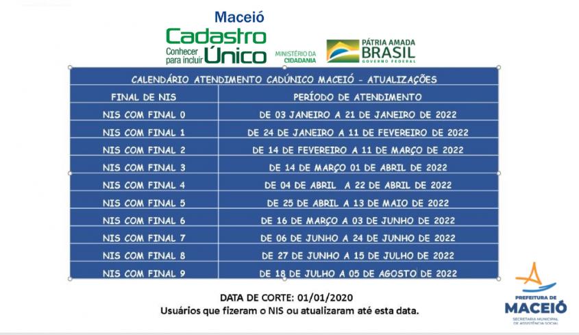 De acordo com o que foi informado pela Semas no início do ano, para quem tem o NIS com final 0, o atendimento aconteceu de 3 a 21 de janeiro. Aqueles com NIS de final 1, o recadastramento acontecerá de 24 de janeiro a 11 de fevereiro. E, assim, sucessivamente, seguindo o calendário. Veja na imagem abaixo: