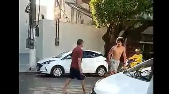 Vídeos publicados na internet (veja abaixo) mostram o momento em que os dois homens trocam agressões, e em seguida o policial militar, que estava de folga, aparece desferindo golpes com terçado contra o carro do rival.
