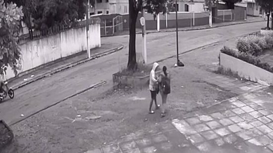 As imagens mostram uma mulher caminhando na calçada, quando dois homens em uma motocicleta cinquentinha se aproximam e um deles desce para abordá-la. O suspeito, que aparece de casaco com capuz e bermuda, insiste na abordagem e segura a mulher por vários metros. Com um sacola nas mãos e uma mochila nas costas, a mulher tenta sair da situação, mas é perseguida pelo assaltante, que agride a vítima no final do vídeo. Alguns veículos transitam normalmente pela rua na hora do crime.
