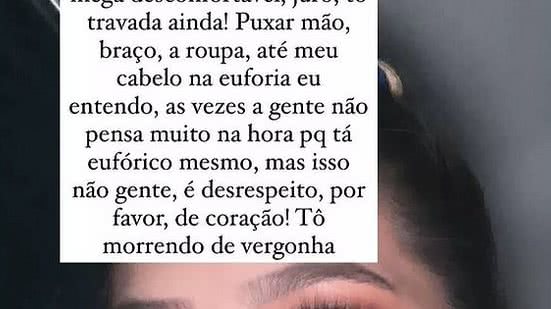 "Gente fui sair do camarote, perdi as contas de quantas mãos estavam tocando nas minhas partes íntimas, fiquei mega desconfortável, juro, tô travada ainda! Puxar mão, braço, a roupa, até meu cabelo na euforia eu entendo, as vezes a gente não pensa muito na hora pq tá eufórico mesmo, mas isso não gente, é desrespeito, por favor, de coração! Tô morrendo de vergonha", desabafou ela na publicação.