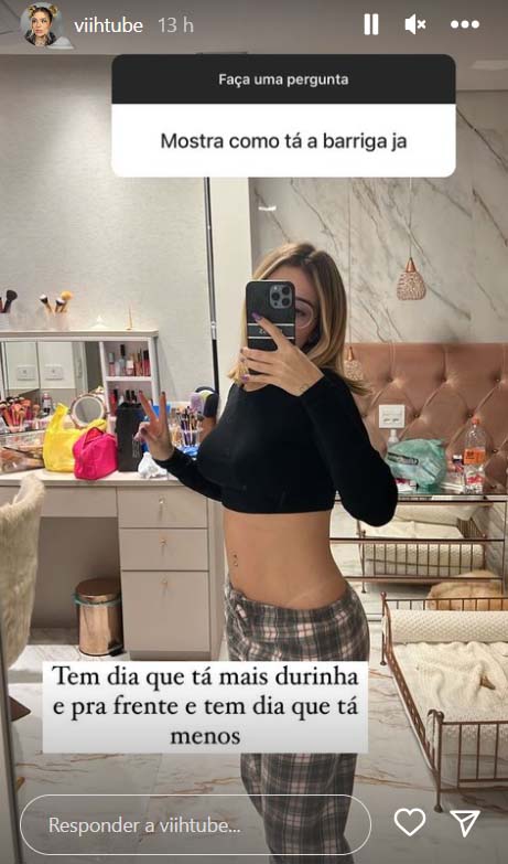 Viih deixou evidente que a barriga ainda está bem discreta e quase não começou a aparecer. “Tem dia que está mais durinha e pra frente, e tem que dia que está menos”, disse ela na imagem.