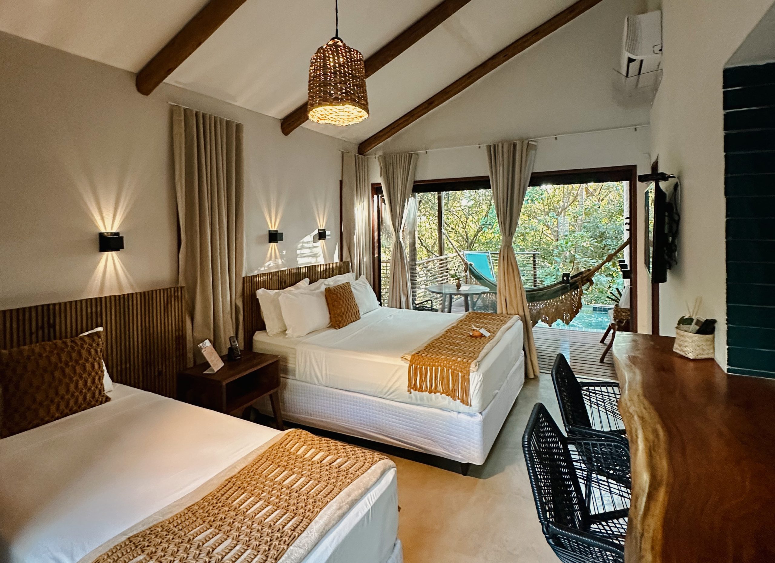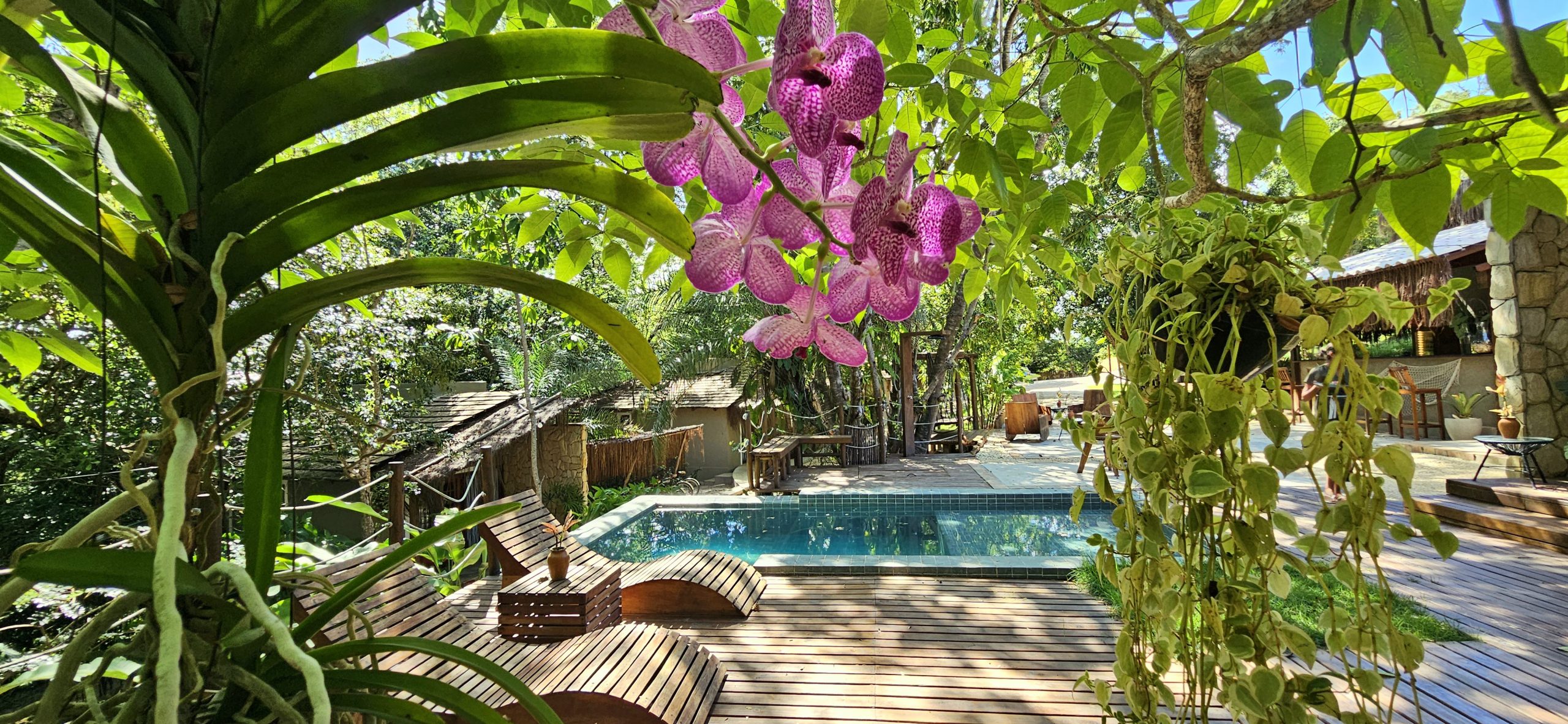 Os bangalôs são batizados com os nomes das arvores: jaqueira, cajueiro, sucupira e aroeira, e todos oferecem conforto em harmonia com a mãe natureza com vista para mata, além de uma piscina na varanda onde se pode tomar café ou um vinho para celebrar a vida. Todos os chalés têm cama de casal queen e de solteiro, frigobar, ar condicionado split, tv de led 43, internet, chuveiro quente, piscina aquecida e com hidromassagem. As suítes possuem o mesmo charme dos bangalôs, com cama de casal queen, frigobar, ar condicionado split, tv de led 43, internet, chuveiro quente. A piscina no jardim também para ficar paquerando a mata.