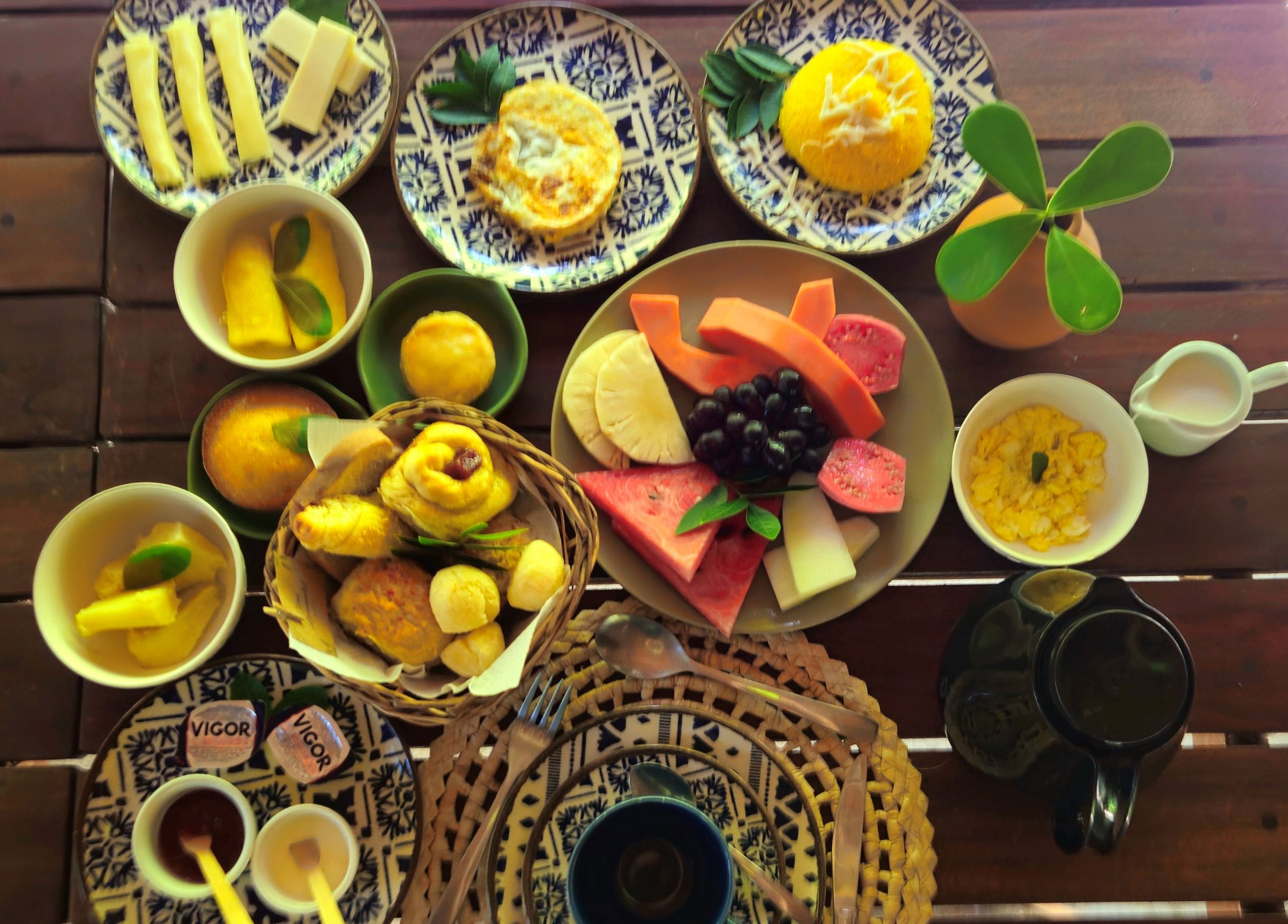 O que comer? Comece pelo café da manhã, que também tem a assinatura de Serginho Jucá (restaurante Sur e finalista do Mestre do Sabor) com o tom do Nordeste, com destaque para cestinhas de pães caseiros preparados na cozinha da pousada. O café é servido para duas pessoas, com frutas da estação, geleias caseiras, requeijão, iogurte natural, granola e mel, bolo do dia, frios, tapioca, misto quente, omelete, batata doce, macaxeira, salsicha ao molho, ovos e carne do sol, banana da terra cozida, banana frita, cuscuz tradicional, cuscuz recheado, empada recheada, café, leite, achocolatado, suco e água.
