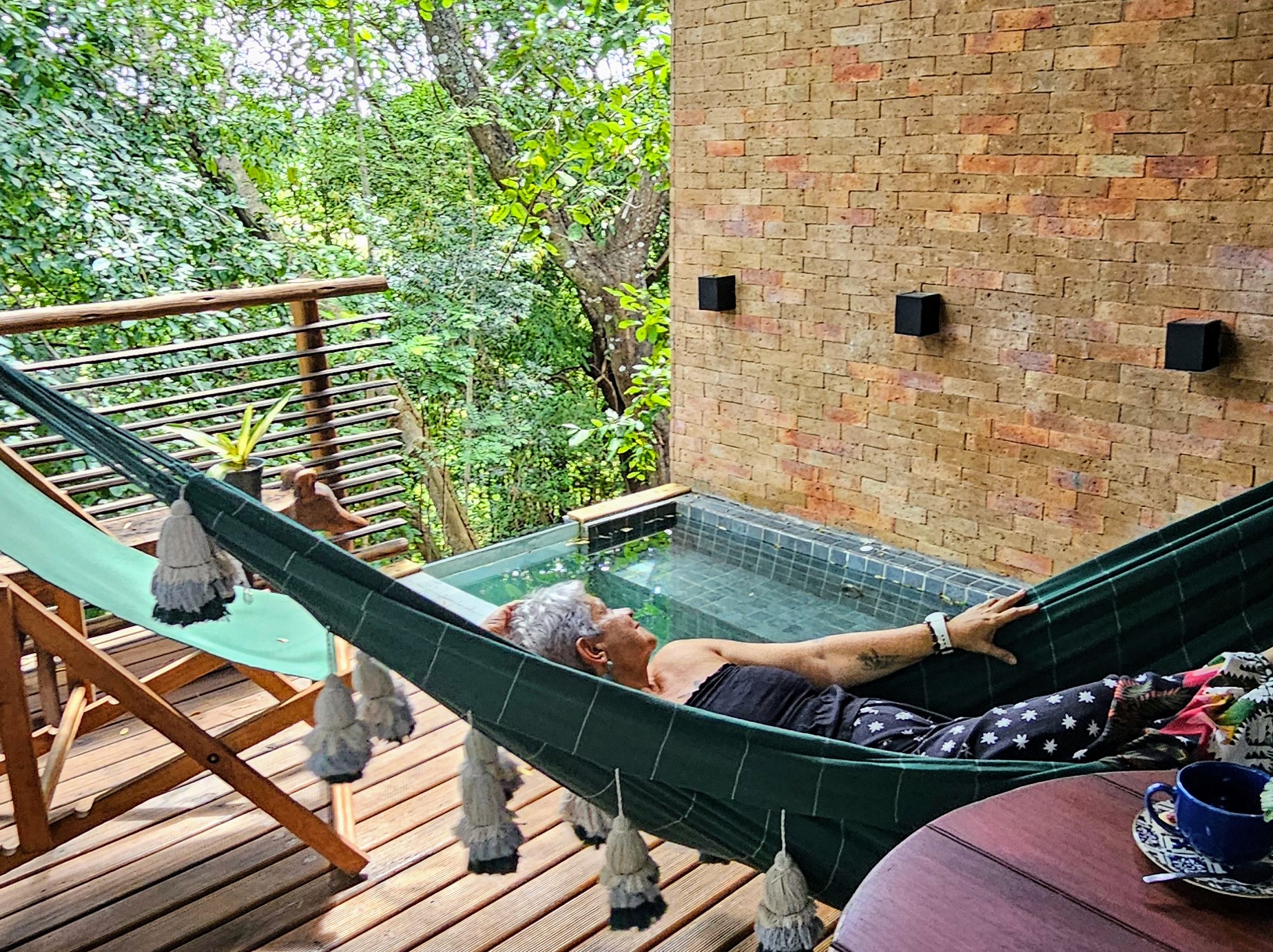 Varanda do bangalô com rede, piscina e natureza sempre por perto