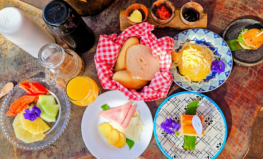 O café da manhã é um capítulo à parte — daqueles que enchem os olhos e o coração: frutas frescas, pães, frios, cuscuz, bolos e aquele cheirinho de comida feita com carinho.